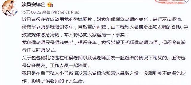 至于包包,是和师父以及朋友一起逛街时买的,她只是个人微博晒图留念,没想到被恶意炒作了。 更搞笑的侯耀华的经纪人也出来了,直接否认了二人的师徒关系,还说对买包的事情不太了解。